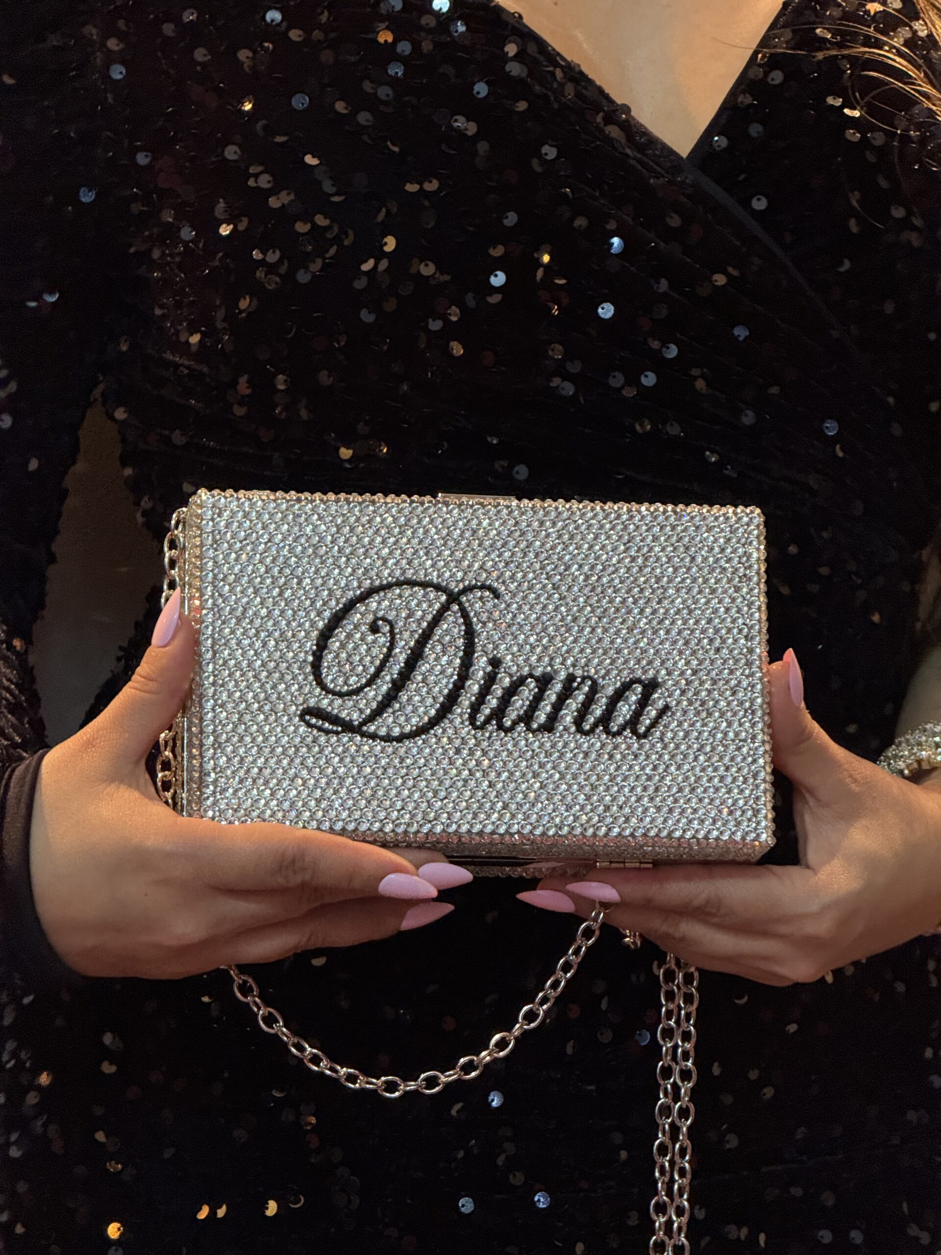 Add a touch of luxury and whimsy to your evening look with this stunning acrylic custom crystal clutch, personalized with your name, numbers, or favorite word. This exquisite clutch is completely decorated with crystals, carefully placed one by one to create a truly unique piece.