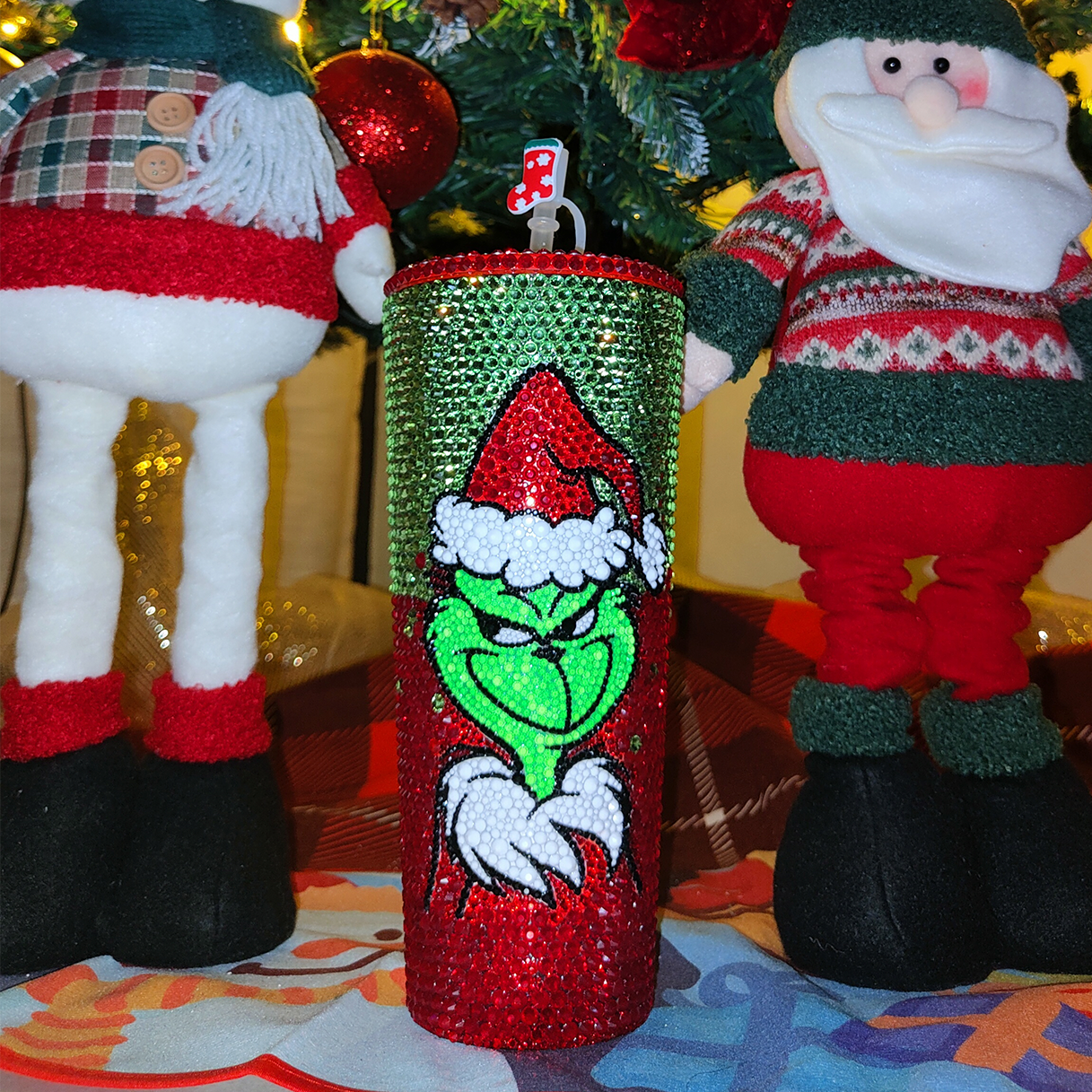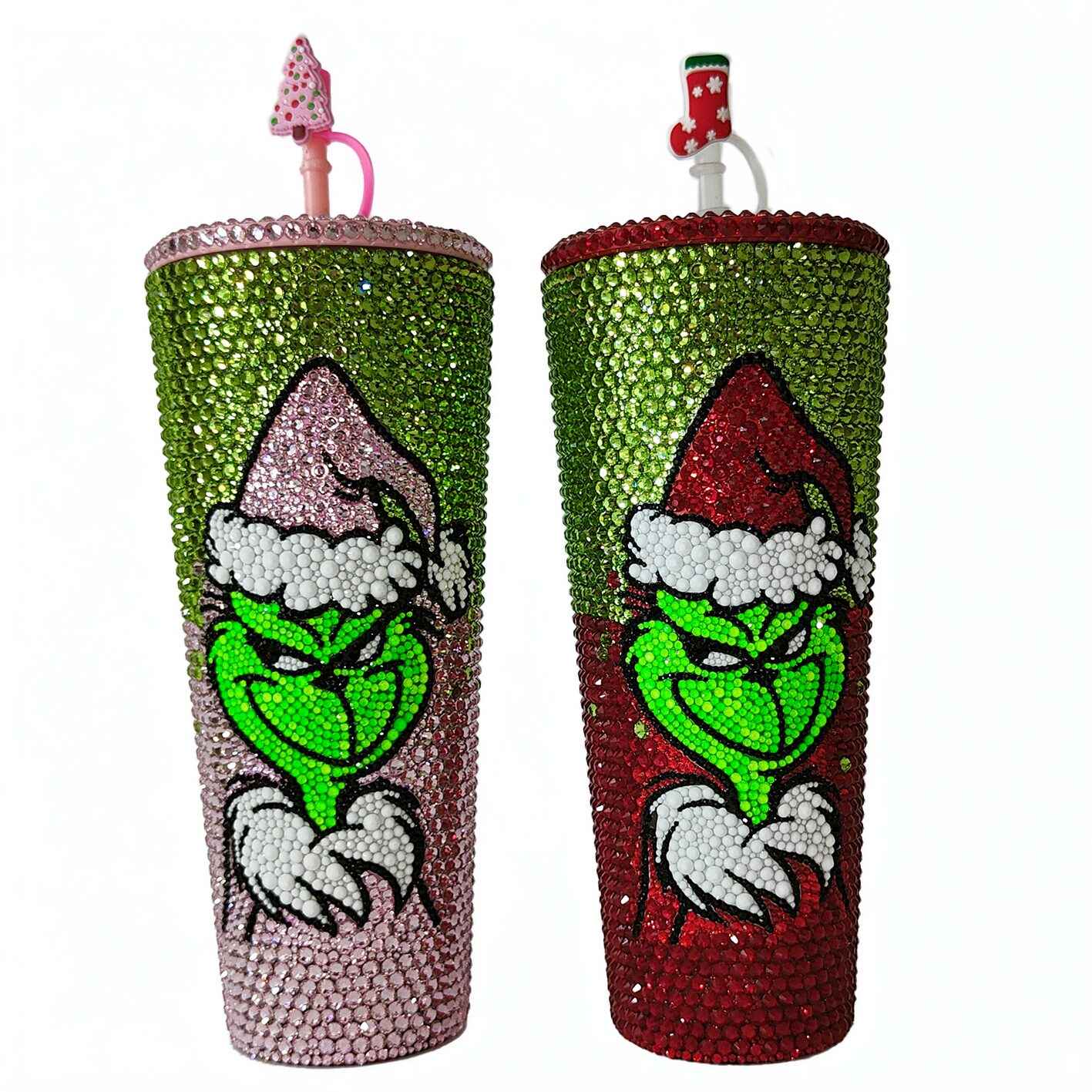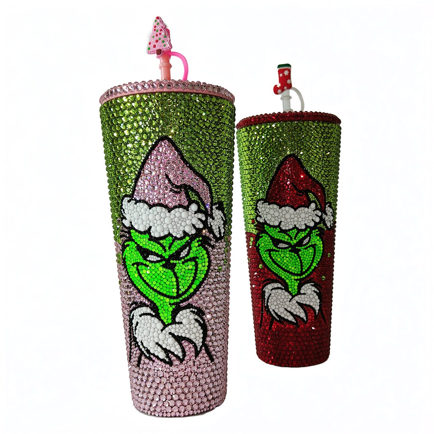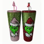 Get ready to add a touch of sparkle to your holiday season with our exclusive Grinch Tumblers. This stunning piece is adorned with over 3,600 luxurious crystals, meticulously hand-placed with absolute precision, making it a true masterpiece that captures the spirit of the season.
